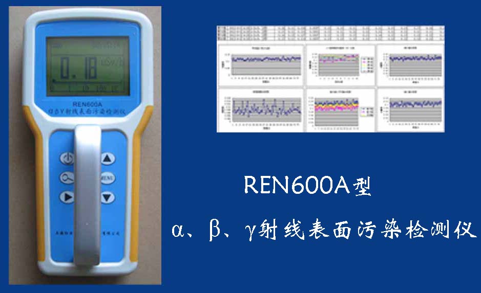 REN600A型α、β、γ射線表面污染檢測儀即可檢測α、β、γ射線,也能檢測到X射線,它采用高速嵌入式微處器作為數(shù)據(jù)處理單元,點陣式大屏幕LCD液晶顯示,讀數(shù)清晰、操作方便,具有400條超大容量數(shù)據(jù)存儲。儀器采用進口的大面積MICA蓋革探測器,具有較高探測效率,可進行α、β輻射表面污染檢測和X、γ輻射劑量率的監(jiān)測。此外通過配套的RenriCont表面污染管理軟件可將存儲的數(shù)據(jù)讀出后分析。可廣泛用在制藥廠、實驗室、發(fā)電廠、進出口商檢、采石場、環(huán)境實驗室、環(huán)境污染調(diào)查、核安全應(yīng)急、緊急狀況營救站、金屬處理廠、地下油田、供油管道裝備、醫(yī)院核醫(yī)學(xué)科、同位素實驗室、環(huán)境保護和警察局等部門。REN600A型α、β、γ射線表面